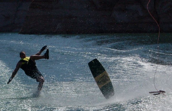 Wakeskating is hard stuff! You don't have bindings holding you on to your wakeboard. Just skateboard grip on top. Kent is great at this as well. This picture is just showing what it looks like when you fall off the wakeskate. |