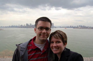 Dan and Kristi at Statue of Liberty looking back at Manhattan Island