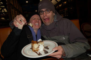 Dan trying to shove another bite of cheesecake into Kristi's mouth.